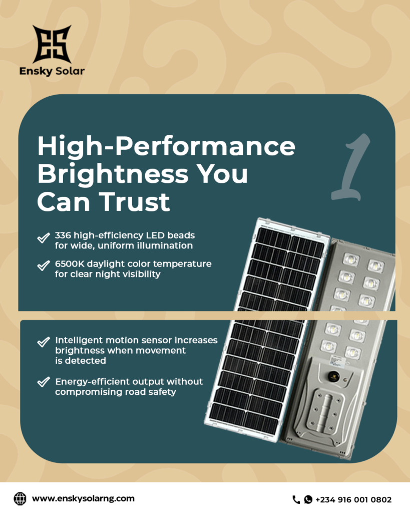 Ensky Integrated Solar Street Lights provide a practical, climate-ready, and cost-effective solution tailored to Nigeria’s realities. With intelligent energy management, high-performance lithium batteries, and a theft-resistant all-in-one design, they deliver long-term value for estates, highways, campuses, and rural communities.